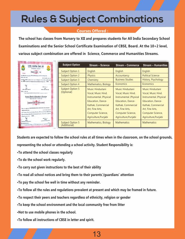 At senior secondary stage, the school is affiliated to CBSE,New Delhi for the following subjects: