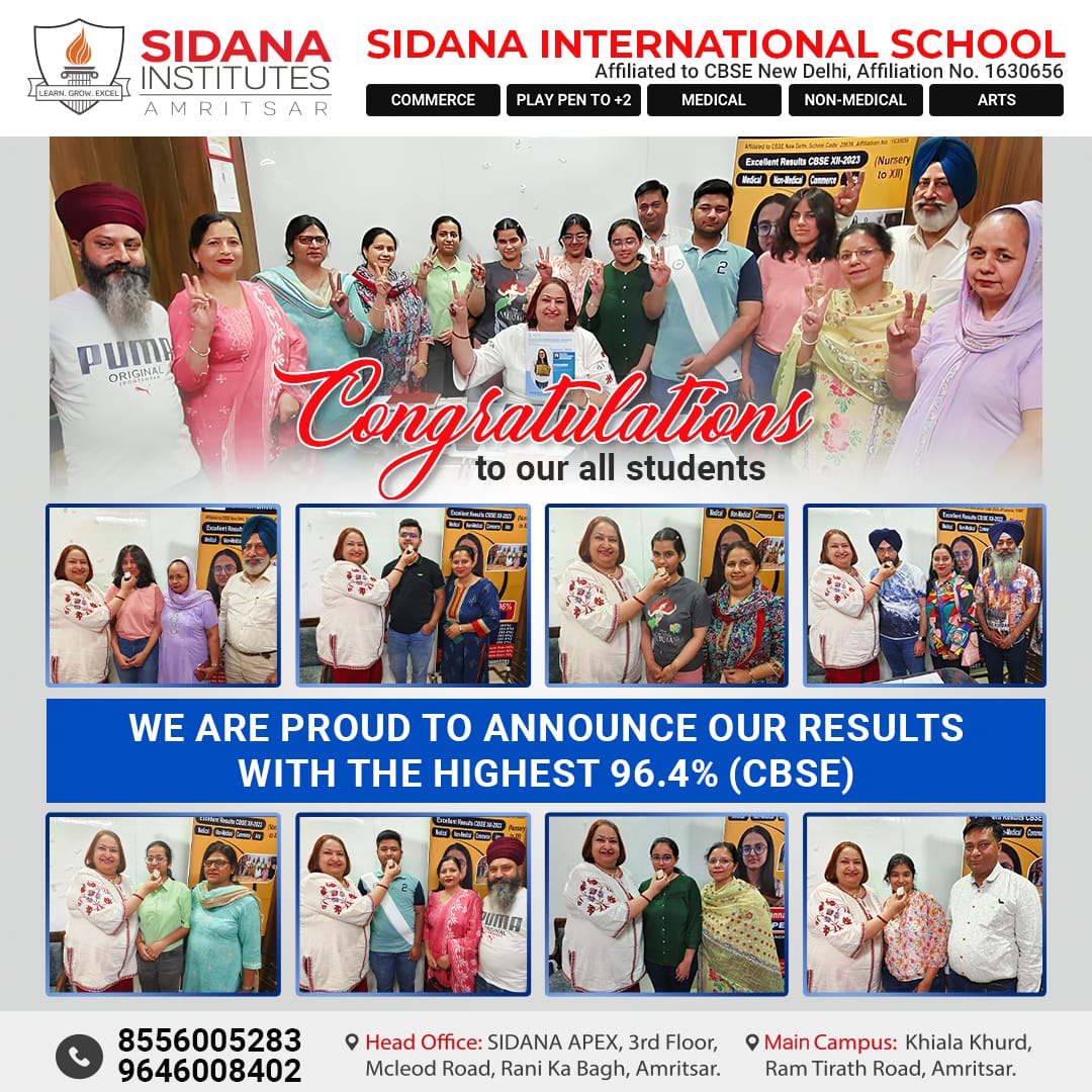 Sidana International School is affiliated to CBSE, New Delhi vide Affiliation No. 1630656 & school Code 20639. CBSE examination is recognized by the Education Department in all Indian States. CBSE examinations Secondary & Senior Secondary are held in March in every year. The school starts from Pre Nursery .We admit students till +2 in all streams.